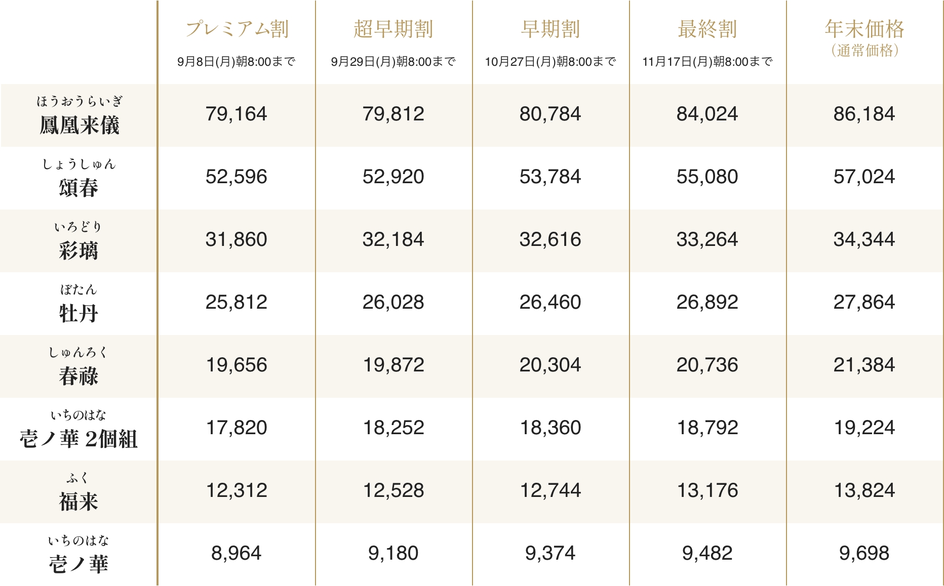 一人当たり最安値は3~4人前の「牡丹(ぼたん)」26,460円(通常:27,864円)、最高値は3~5人前の「鳳凰来儀(ほうおうらいぎ)」80,784円(通常:86,184円)でした。