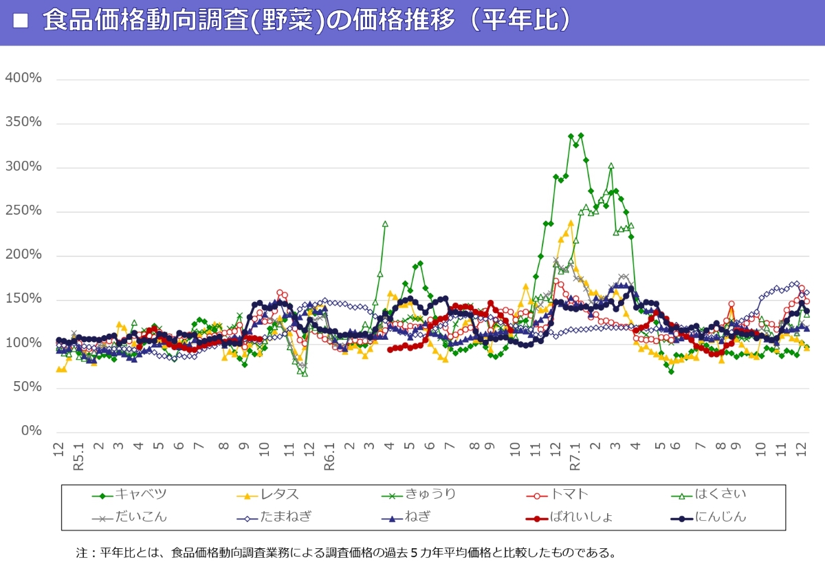 農林水産省の「食品価格動向調査(野菜)」によれば、令和7年12月8日の週時点で、ねぎ(平年比118%)、たまねぎ(同159%)、トマト(同149%)、にんじん(同138%)、はくさい(同134%)、だいこん(同119%)など、主要8品目の多くが依然として平年より高い水準で推移しています。一方、キャベツ(97%)やレタス(96%)は平年比で安価な水準となっていました